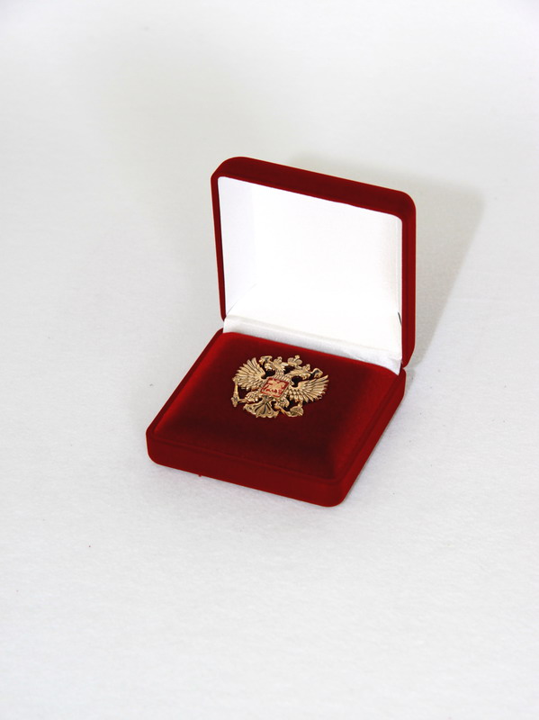В футляр изготовлен флокированный ложемент с углублением под индивидуальную знак "герб Российской Федерации".
