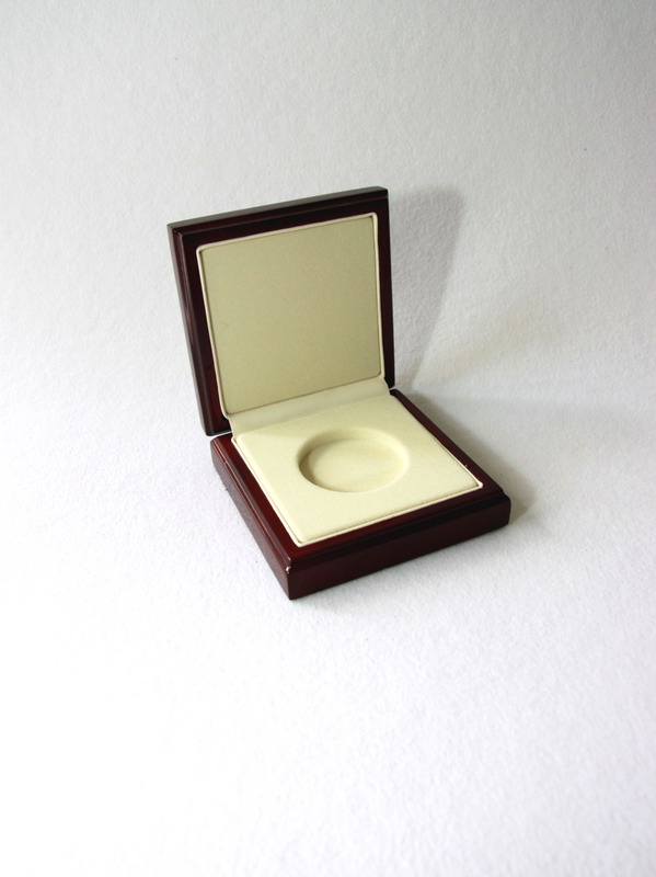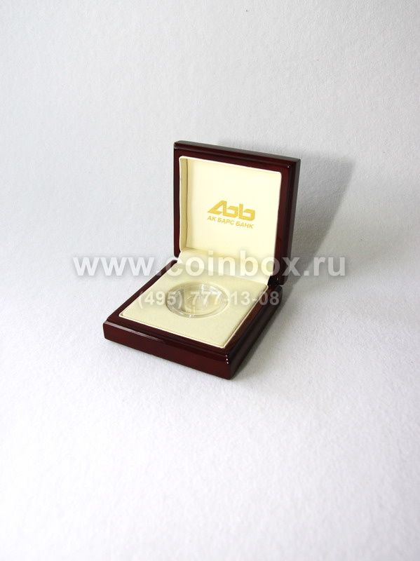Деревянный футляр с индивидуальным ложементом под монету в капсуле. В крышку футляра нанесено изображение с логотипом банка.