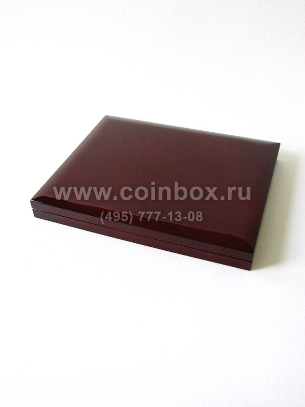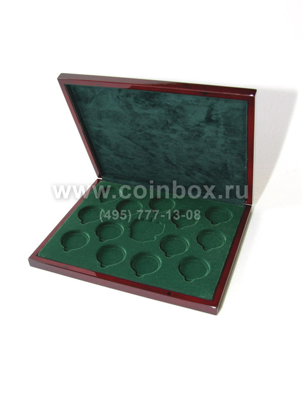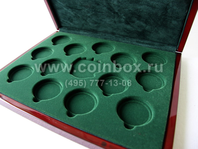 Футляр деревянный с индивидуальным флокированным ложементом под 13 монет в капсулах (диаметром 46 мм) и герб.