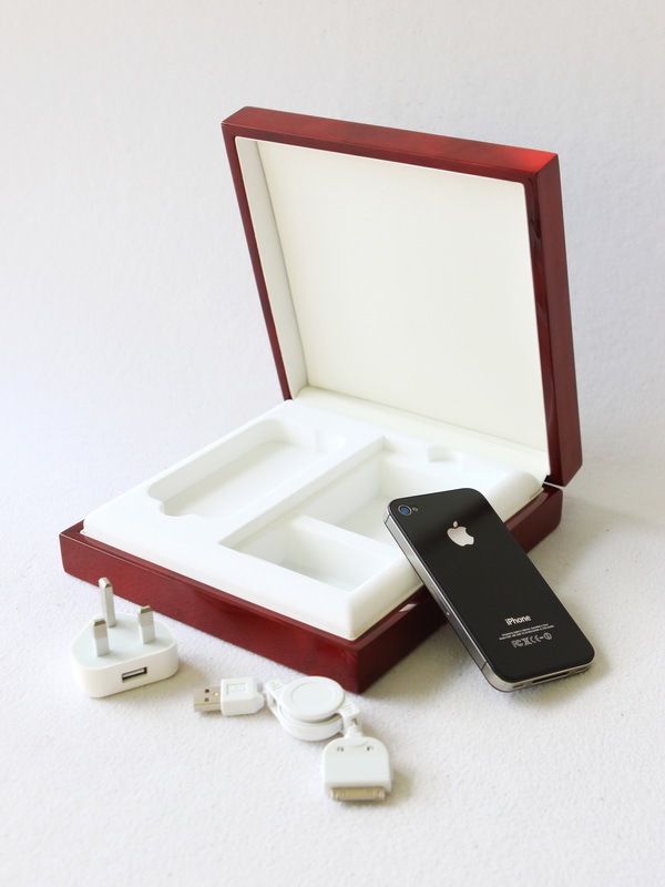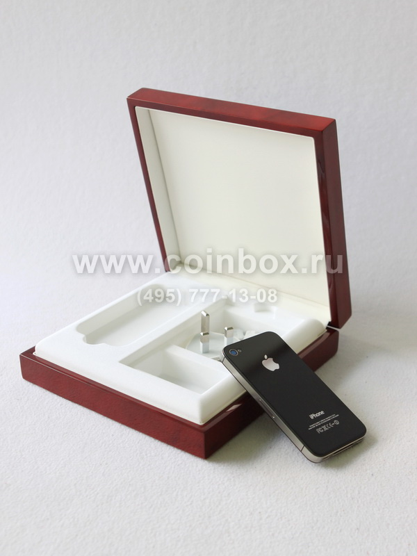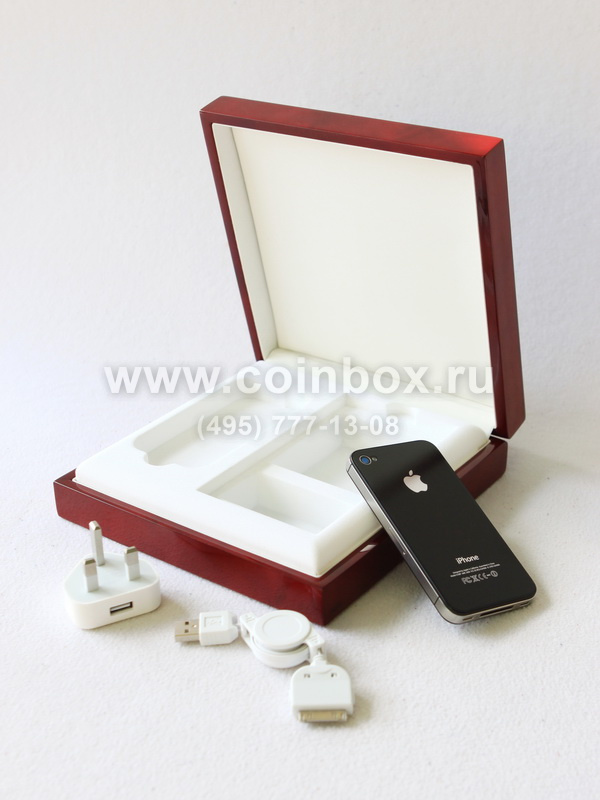 Деревянный футляр с ложементом под мобильный телефон и набор аксессуаров (USB провод, зарядка, наушники и книжка) был изготовлен по специальному заказу для серии эксклюзивных мобильных телефонов марки Apple.