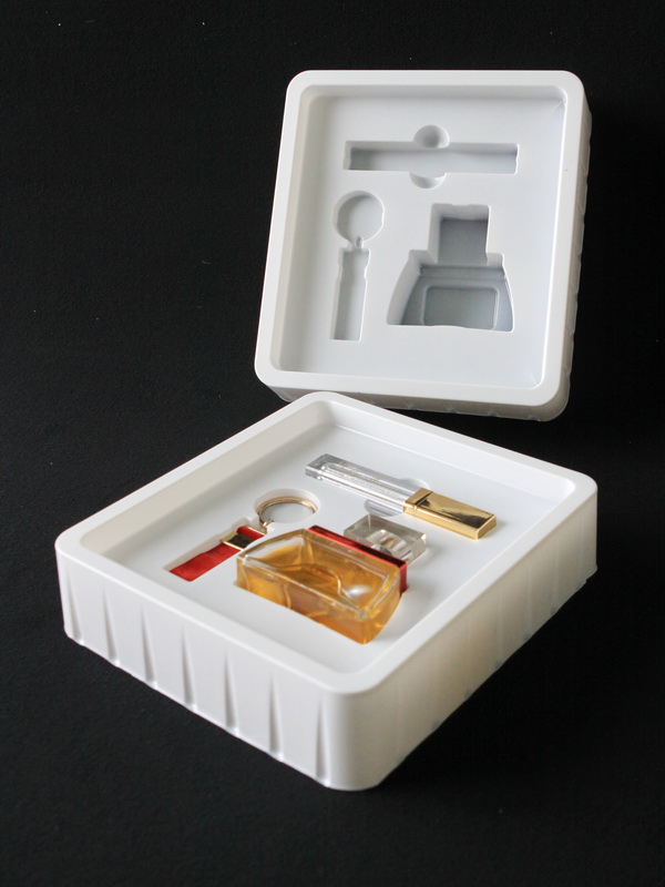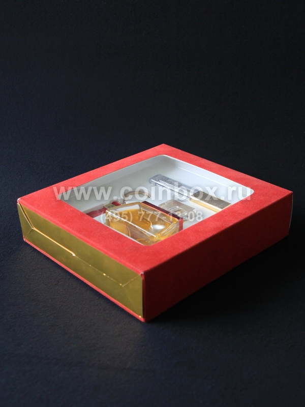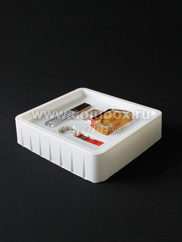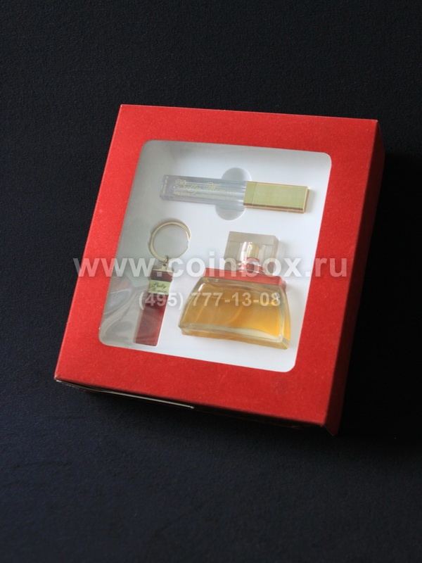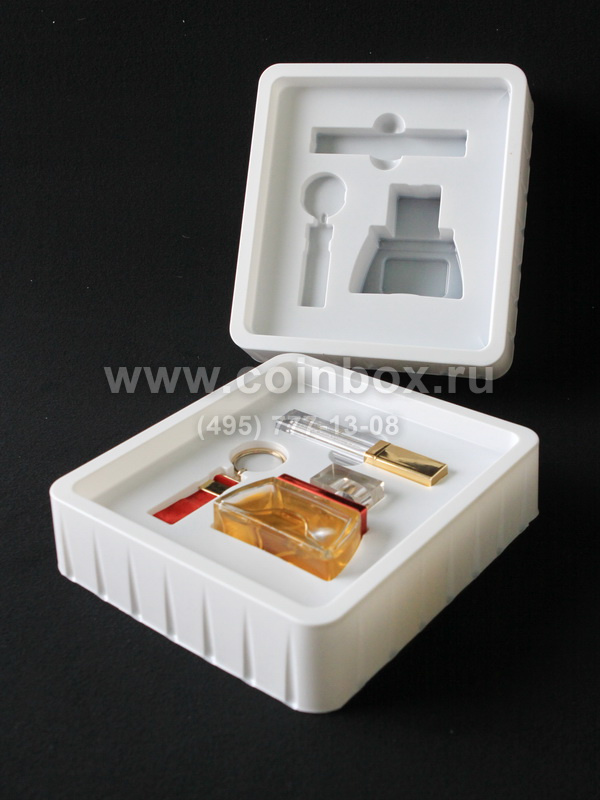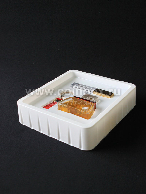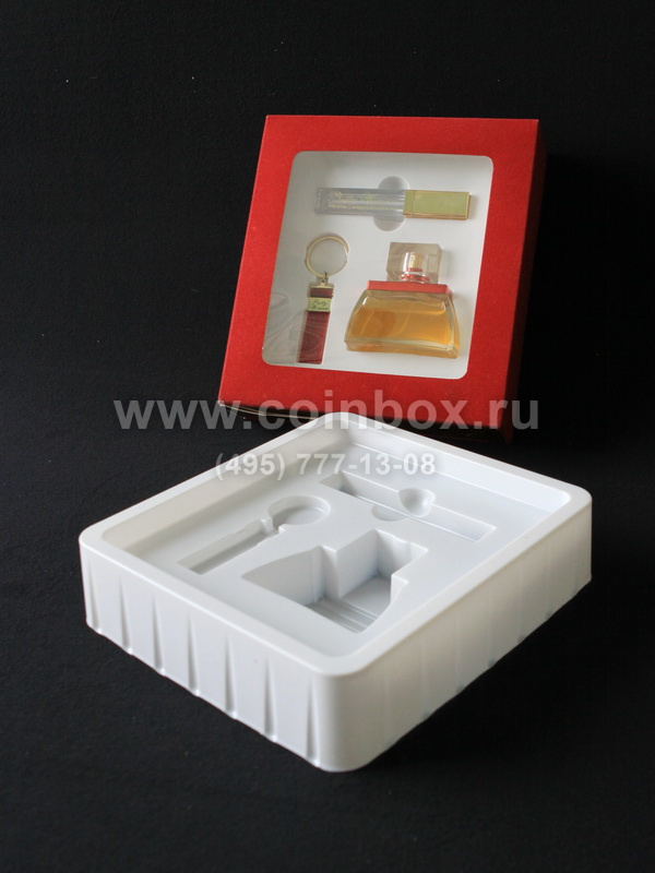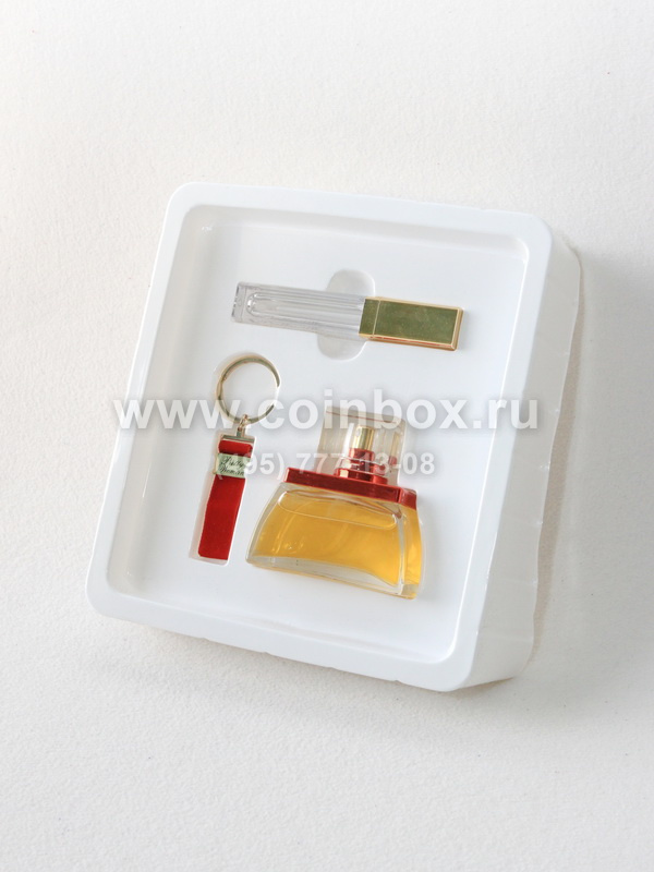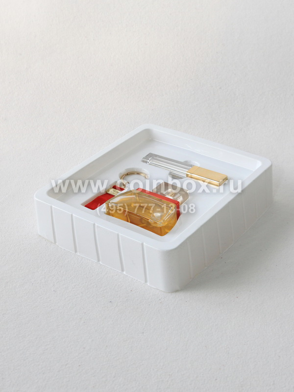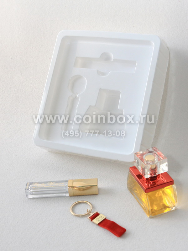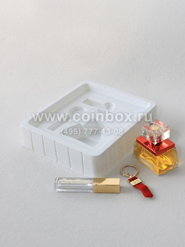 В ложементе сделаны углубления под флакон духов, блеск для губ и брелок. Ложемент укладывается в подарочную картонную коробку.