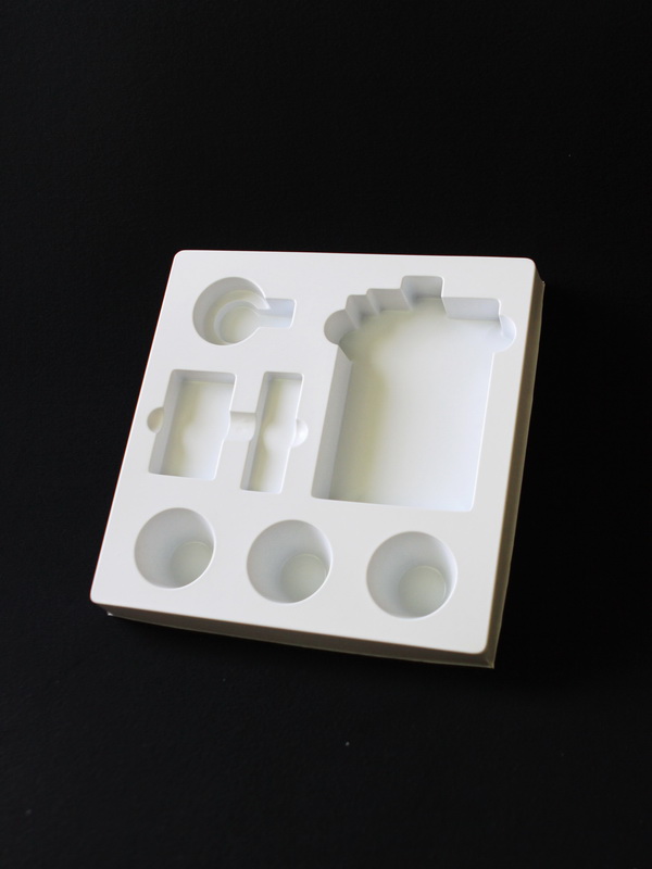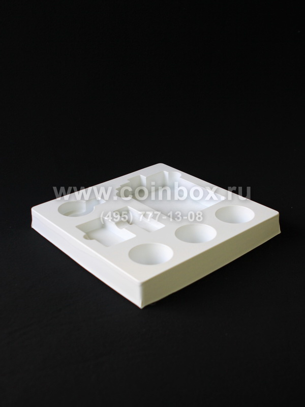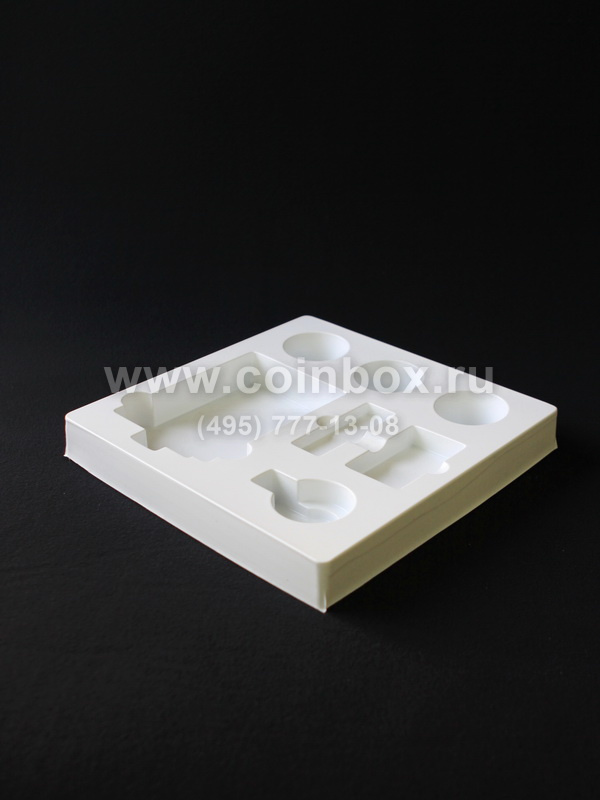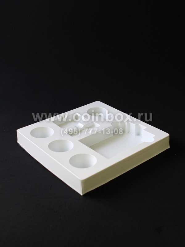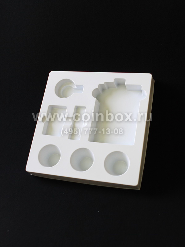 Данный ложемент изготовлен для сувенирного набора, посвященному 9 мая (фляжка, стопки, часы, зажигалка, нож). Готовый пластиковый ложемент вставлялся в праздничную картонную коробку. Для наглядности мы изготовили ложемент из разных материалов и в разных цветах.