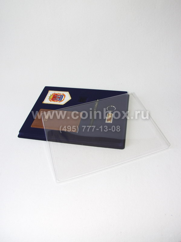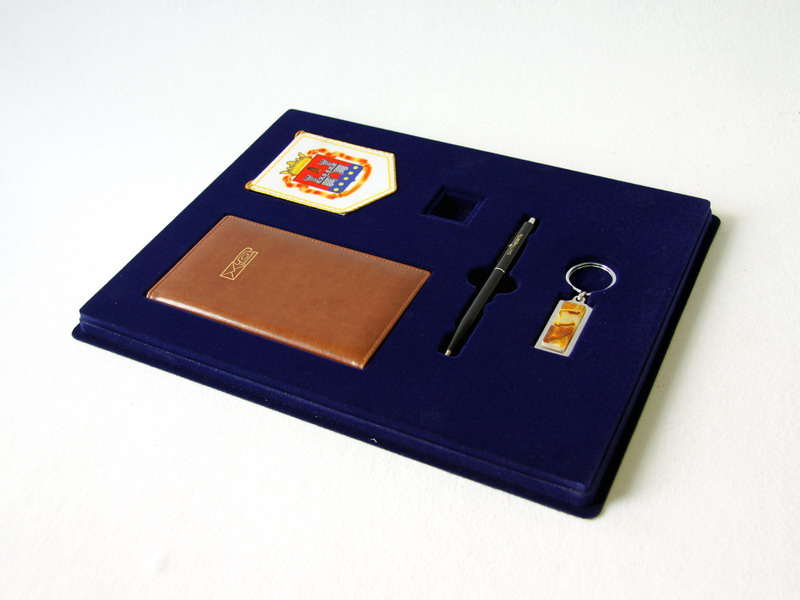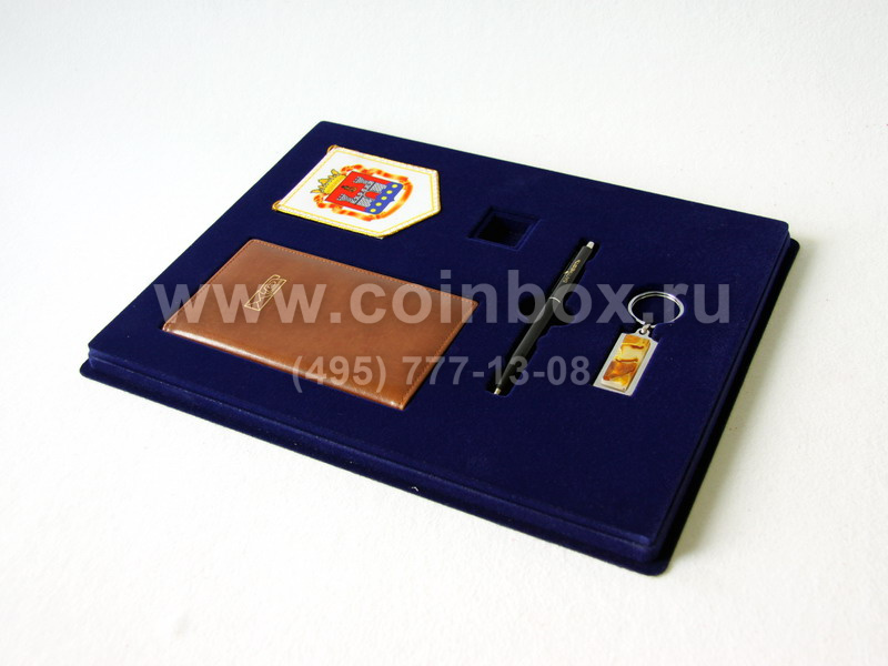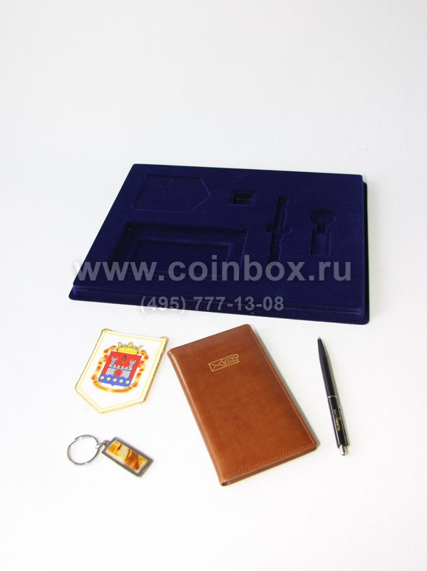 На фотографии представлена сувенирная упаковка с прозрачной крышкой под набор из 5 предметов (записная книжка, вымпел, ручка, брелок и значок).